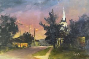 Evening at Balduccis. 12″ x 12″ oil on canvas panel. Plein Air: Augusta, MO.